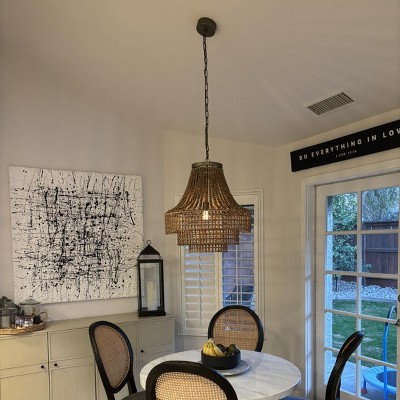 Storied Home Metal Rattan and Wood Bead Chandelier Brown: ETL Listed, Iron Canopy, Adjustable Height