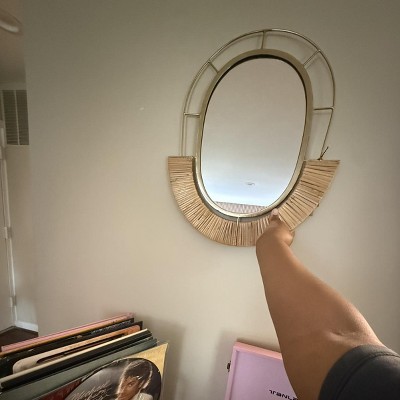 Add style and depth to any space with this artfully crafted wall mirror; Ideal for bringing a natural element into small spaces, or adding a hint of texture to a boho gallery wall. Oval metal framed wall mirror in a gold finish with woven cane detail on one side; Can be hung vertically or horizontally. Equipped with keyholes for easy mounting.