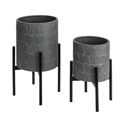 Storied Home Round Metal Planter with Chevron Pattern on Stand, Black