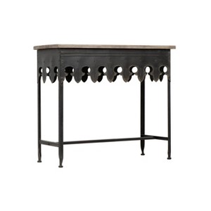 This elegant console table seamlessly blends vintage charm with modern functionality. Crafted from durable iron with a distressed black finish, this table features weathered grey steel accents and solid wood top that adds a touch of rustic charm. Each piece is uniquely varied and distressed, giving it a character that is truly one-of-a-kind. Measuring 36 inches wide, 16 inches deep, and 31.75 inches high, this table is perfect for use as a console table in an entryway, hallway, or dining room. Alternatively, it can be used as a sofa table in your living room, adding a touch of vintage appeal to any space. Its sturdy construction ensures that it can hold up to even the heaviest items, making it a practical and stylish choice for any home.