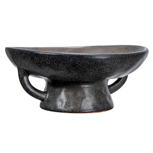 Indulge in the boho-inspired charm of this stoneware bowl, featuring a stunning black reactive glaze that adds depth and character to its organically-shaped silhouette. This serving bowl is a true work of art, with a sculptural base and handle that will elevate any dining space. Crafted from 100% stoneware, this bowl is as durable as it is beautiful, ensuring that it will last for years to come. The natural variation of the reactive glaze creates a unique and captivating finish that is completely one-of-a-kind. Whether displayed alone as a standalone accent piece atop a console table, or filled with your favorite dried botanicals, this bowl is perfect for adding a touch of artisanal charm to any interior design scheme. Its food safe design also makes it a unique serving dish that is sure to impress guests at a dinner party.