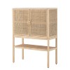 - Add a touch of natural and tropical charm to the space with this gmelina and rattan cabinet that features two doors and a woven rattan design