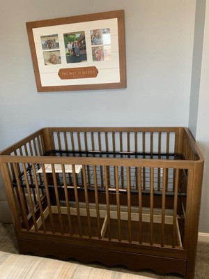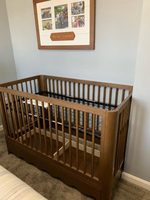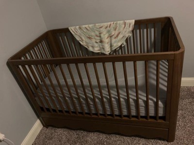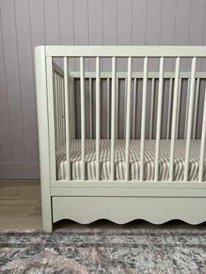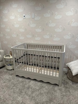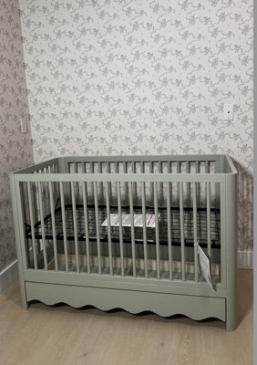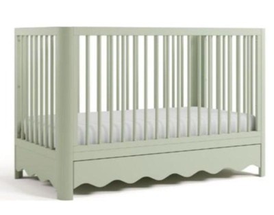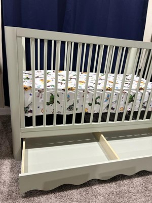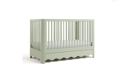 [This review was collected as part of a promotion.] This crib is stunning! The wavy bottom edge is what sold me on this crib! Sage was a stunning color for both boy or girl rooms! The drawer on the bottom is such a great bonus storage space. It’s simple yet stunning and so easy to put together only taking about one hour to build and set up! I am very happy with this crib and cannot wait to use it for years to come as it converts beautifully!