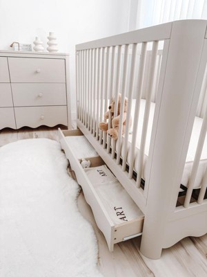 [This review was collected as part of a promotion.] I was drawn to the scalloped detail of the crib and then realized it is also a storage drawer! I have a small nursery and this fits perfectly with additional storage for my little one. I love that it has rounded corners so I am not worried about sharp edges when baby is on the move. Also the perfect height for me getting baby in and out as I am more petite build.