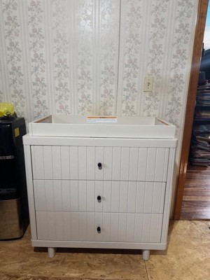 [This review was collected as part of a promotion.] Cute dresser/changing table. 3 drawers that open one at a time (it locks the other drawers). Took 3 guys approximately 30 mins to put together. I would just advise to be very careful with the wood for the bottom of drawers as they split/break very easily. Use extra caution if you choose to use power tools to assemble! Adorable and matches the aesthetic of our nursery perfectly!