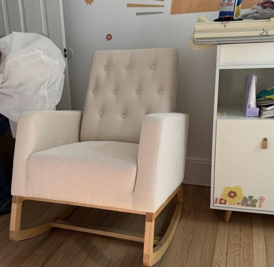 This rocking chair is amazing. I love how comfortable it is. Fabric and cushion are soft. Nice cream color. Recommend 100%.