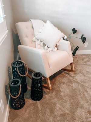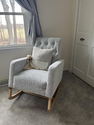 - ROCKING CHAIR FOR NURSERY: Stylish, comfortable mid-century modern rocker with gentle rocking motion; Fully upholstered with a quilted, button-tufted pattern; Durable, solid wood base