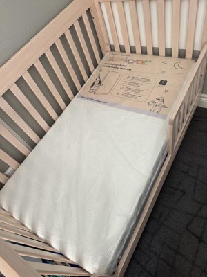 [This review was collected as part of a promotion.] A budget-friendly, affordable crib/toddler mattress that gets the job done with a thoughtful dual-use design and easy-to-clean cover — great value for everyday nursery use. Pros: Dual-sided design: Firmer infant side and softer toddler side help extend use as your child grows. Easy to clean: Water-resistant and removable cover makes quick cleanups after accidents simple. Comfortable & light: Many parents say it’s comfortable for babies and light enough to change sheets easily.  Cons: Basic firmness: Some people note the difference between infant and toddler firmness isn’t dramatic, and foam may feel softer than some other options.