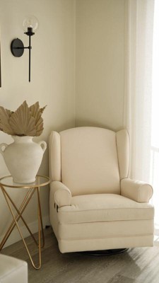 I liked this cream colored chair for our nursery and the classy look of the wingback. Would probably look great in any nursery. It was also one of the few in my price range that rotate, rock and recline. The chair disappointed in two big ways: way too firm and so hard to return to a seated position. Too bad it's so hard to find a place to test out nursery chairs before you buy them. Would probably not have purchased this chair.