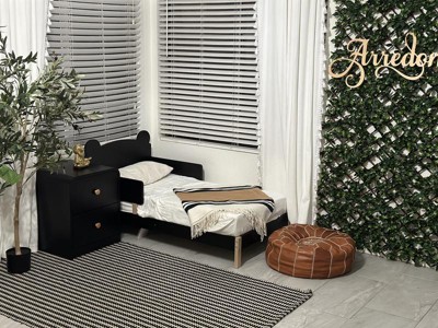 Well, I’m super impressed with this kids toddler bed, it is crib size making it perfect for small spaces. Made up of sturdy wood. It was so simple to build. It literally took me about 40 minutes to put together. I love the contrasting color of the black and oak. I also enjoyed that it has plenty of wood slats to support the mattress and that it sits low to the floor, just in case. I honestly feel you can’t go wrong. Just buy the whole set.