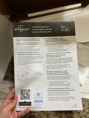 The Storkcraft Teddy Bear Toddler Bed is crafted with from pine wood, wood composites, and engineered wood, and its applied finish has been tested to meet or exceed the applicable ASTM and CPSIA safety standards. The Storkcraft Teddy Bear Toddler Bed is is GREENGUARD Gold Certified – certified products are screened for more than 10,000 chemicals and VOCs known to pollute indoor air. Also, the Storkcraft Teddy Bear Toddler Bed is Baby Safety Alliance Verified — meaning it’s been expert tested by third-party, accredited laboratories to meet or exceed all of the applicable category voluntary and mandatory safety standards. For your toddler’s added security, the Teddy Bear is equipped with toddler safety guardrails, and fits any standard full-size crib and toddler mattress (we recommend any Graco toddler mattress). Storkcraft is the proud recipient of the Parent Tested Parent Approved (PTPA) Seal of Approval for nursery and children’s bedroom furniture, and the Women's Choice Award for 9 out of 10 Recommended Baby & Kids Furniture. Backed by a 1-year limited manufacturer’s warranty. Assembly required. Toddler mattress sold separately. Toddler safety guardrails included.