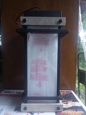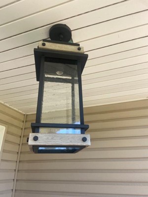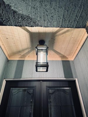 [This review was collected as part of a promotion.] I was gifted this item for free from #influencer in exchange for my honest review . This outdoor hanging lantern light provides a stunning farmhouse style vision. A matte black frame with wood like accents and slightly textured glass to provide that old work charm. It comes with a suspension chain that is long enough to adapt to a tall entryway or it can be easily manipulated to go as short as needed. I would recommend that your ceiling be 10 foot or higher if placing in front of a doorway. It used one bulb and was super easy to install with plenty of wiring. Very well crafted The mounting plate is a good size as well which allows to cover up the area from your previous installation with no additional paint touch-up. I also feel that this hanging lantern could easily be placed on a table with a battery operated candle for a nice decorative setting or a light source on a garden path. This lantern is eye catching and can be used in various applications, not just a hanging lantern.