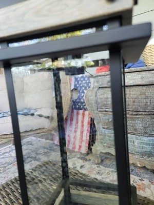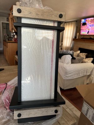 - Matte black finish features grey wood accents for a farmhouse vibe