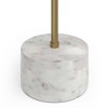 - Features round solid acacia top, antique brass look stem and solid white marble base