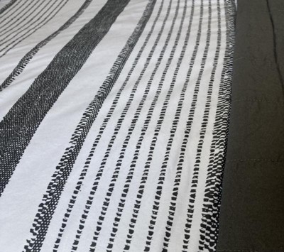 Pros: fabric is soft. Cons: is much larger than my king sized duvet. There is so much extra fabric I don’t know what to do with it. Also it looks like a plain white duvet - gray stripes are pretty light.