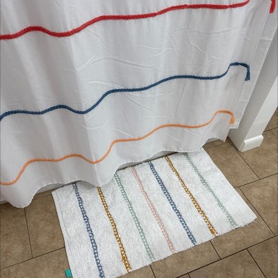Bring soft texture to their bath space with this Stripe Bath Rug from Pillowfort™. This rectangular bath mat makes a wonderful addition to their bathroom decor. It features a white backdrop with repeated stripes for a modern flair. The 100% cotton construction makes it highly absorbent, while the tufted texture provides them fluffy and soft comfort underfoot when they brush their teeth or step out of the shower. Coordinate with similar bath accessories to bring a cohesive look to their bathroom. Rug pad recommended.