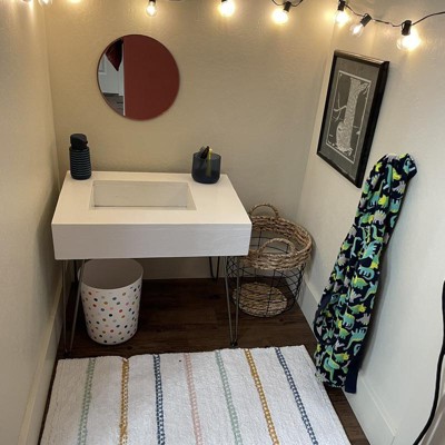 The cutest rug that holds up shape, doesn’t shift or ravel up, is super washer friendly (which is very nice considering bathrooms are gross), and feels good beneath the feet after stepping out of the tub.