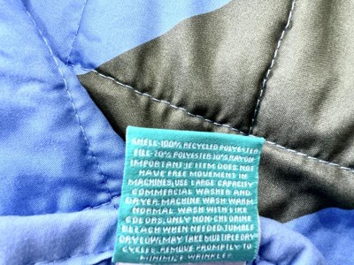 This quilt is very light but it's soft and warm. 100% recycled polyester was used, and the tag says there's no harmful chemicals are in it. So I feel safe and comfortable. Two tone colors aren't actually bad - colors are cute. Hopefully it'll wash well, but I'm very happy with it.
