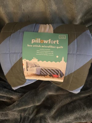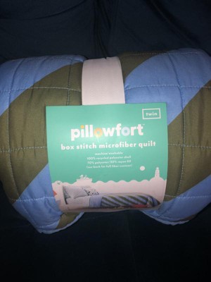 PillowFort box stitch micro fiber Twin quilt color is blue and green with a solid blue backing. Blanket is soft and feels light weight, I washed this blanket before using and it washed and dried well.