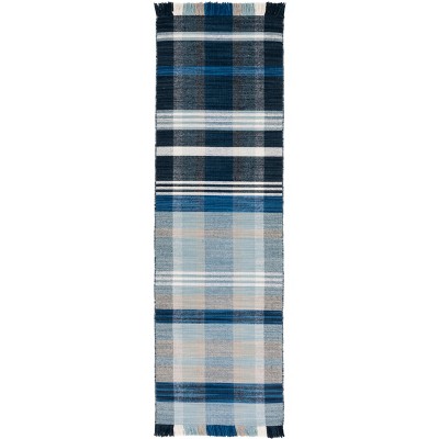 Elevate your home decor with this stylish area rug, crafted in India and designed to bring a touch of contemporary elegance to any space. Sized at 2 feet 3 inches by 8 feet, this runner fits perfectly in hallways or narrow spaces. The cool tones of grey and blue offer a soothing and versatile palette, while the flat weave technique provides a sleek finish with a height of just one-fourth inch. Made from cotton, this rug combines comfort and ease of care, making it a practical choice for busy areas. With its minimalist design, this rug adds an understated yet sophisticated touch to your home. Transform your floors with this modern rug and create a welcoming ambiance that speaks to your unique style.