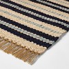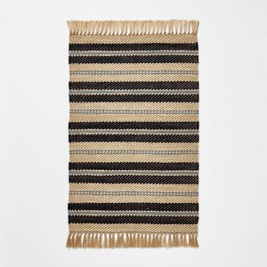 A: The rug features a striped twill design with blue stripes on a tan backdrop.