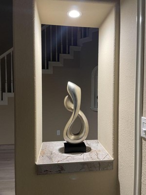 The silver leaf open infinity sculpture makes a bold, yet elegant, statement with its flowing design. Constructed from polyresin, and resting atop a black finish stand, this piece is breathtaking above a fireplace mantel.