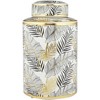 Sleek and simple in a cylindrical silhouette, this contemporary decorative jar and lid add personality to your decor. Myriad palms in tones of yellow, gray and black add dimension and artistry while gold trimming creates a polished finish. Porcelain construction adds a touch of delicacy as the jar offers a charming place to stash essentials.
