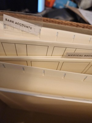 Out of 20 folders 1 for Bank accounts 1 Family Health profile-not even expandable 1 Insurance Details 1 Home Improvements 2 for yearly vehicle maintenance 3 for taxes The rest -10- are blank I don’t know of others but I purchased due to the impression all 20 were printed on with charts or grafts. No 1 folder listing Rectangular squares for 5banks? 1 folder w/7 printed rectangles for each family member Just put out not more then 1; for of most of the folders