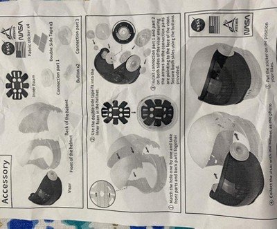 Instructions could be a lot better. Took me a bit to make sure I was putting the shield on properly cause once they get snapped in, I think it would break if you tried to pop it back out. The stripe sticker does not lay flat onto the helmet since it’s round so if you do purchase this helmet expect there to be parts lifted/bent. The blue face shield did come a bit scratched which you can’t really see in the pictures, but when you put it on you can. It can also be a bit stuffy with it closed, but if there’s a breeze it’s okay. It does open and close pretty easy. I bought it last minute because my kid is going to be an astronaut and the colors matched his costume. For the price I would expect it to be better and overall I would not waste your money on this.