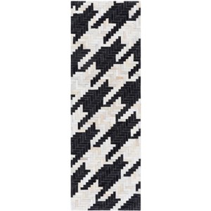 Indulge in the sophisticated design of this incredibly plush 2'3" x 7' ivory and black runner area rug made passionately in India. Hand woven with exquisite craftsmanship, this stunning and unique piece is constructed from top-quality leather, giving it a rich and luxurious texture. The chic ivory and black color scheme is effortlessly refined, adding a dash of elegance to any living space. Plus, with a comfortable 1/4" height, this runner rug beautifully defines your floor without being too bulky. Upgrade your home decor with this remarkable piece of art; it's not just a rug, it's a lifestyle statement.