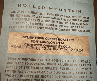 - Contains one (1) 18 Ounce Bag of Stumptown Holler Mountain Organic Whole Bean Coffee