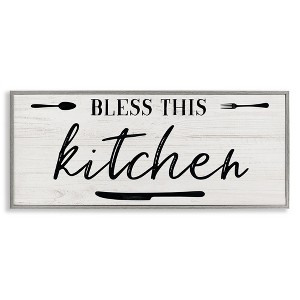 Stupell Industries Bless This Kitchen Phrase Minimal Typography Fork Knife Framed Giclee Art, Gray, 24" x 10"