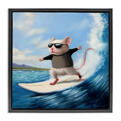 Stupell Industries Cool Surfer Mouse Blue Ocean Waves Floating Frame Canvas Art, Brown, 18" x 18"