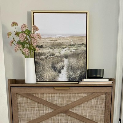 Stupell Industries Distant Shoreline Grassy Beach Path Cloudy Horizon Floating Frame Canvas Art, Gray, 25" x 31"