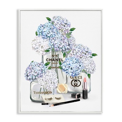 Stupell Industries Glam White Blue Hydrangeas Designer Perfume Bottles Lipstick Illustration Framed Giclee Art, Gray, 11" x 14"