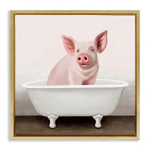 Stupell Industries Pink Farm Pig in Country Bath Tub Floating Frame Canvas Art, Gold, 25" x 25"