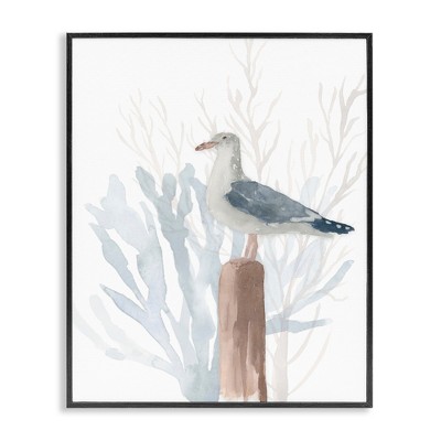 Stupell Industries Relaxed Nautical Seagull Beach Bird Blue Sea Coral Framed Giclee Art, White, 11" x 14"
