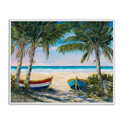 Stupell Industries Row Boats on Beach Shore Tropical Palm Trees Framed Giclee Art, Gray, 30" x 24"