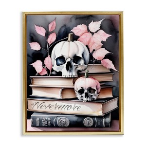 Stupell Industries Spooky Skull Book Stack Floating Frame Canvas Art, Gold, 25" x 31"
