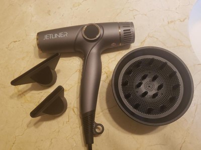 Stylecraft and Silver Bullet introduce the JetLiner cutting-edge long life digital brushless motor hair dryer, a game-changing tool that will revolutionize your hairstyling experience. Operating at an incredible 105,000 RPM, this motor delivers powerful and efficient performance, ensuring quick drying and styling. The digital display features 5 preset heat/speed settings designed specifically for fine, normal, and coarse hair, with a turbo mode for rapid drying and a manual mode for customized performance. With a total of 13 heat/speed settings available in manual mode, you can find the perfect temperature and airflow for every hair type.Experience salon-quality results with our Ionic Generator technology. This advanced feature seals the hair cuticle, creating a smooth and shiny finish while reducing frizz. Say goodbye to unruly hair and hello to a sleek and polished look that lasts. The professional 9 ft cord provides ample reach and flexibility during use, and the convenient hanging hook ensures easy storage when you're done. The auto-locking function ensures that your selected speed and heat settings remain consistent throughout your styling session, eliminating the frustration of accidental adjustments.Cleaning and maintenance are a breeze with the removable filter, allowing for easy removal of debris and hair. Additionally, an extra foam filter is included for added convenience. Never worry about losing your preferred settings again with the memory feature, which recalls your last used heat and speed settings. This time-saving feature ensures consistent and reliable results with each use. To top it all off, this hair dryer comes complete with two specialized styling nozzles and a diffuser, giving you the versatility to create a wide range of styles, from sleek and straight to bouncy and curly. Upgrade your hairstyling routine with our Long Life Digital Brushless Motor Hair Dryer and unlock endless possibilities for flawless hair every day.STYLECRAFT, THE ART & SCIENCE OF STYLING.
