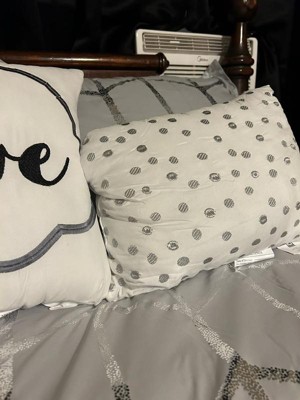 Freshen up your bedroom with the enchanting style of Intelligent Design’s Raina Comforter Set. The stunning comforter flaunts a geometric, metallic silver print against a soft grey ground for a fun and eye-catching look! Matching sham(s) echo the design seen on top of the bed to pull the entire ensemble together. Two embroidered decorative pillows with typography and metallic details complete this fabulous, ultra-soft microfiber comforter set. Set includes comforter, 2 shams (1 sham in Twin/TwinXL), 1 oblong and 1 square decorative pillows. This bedding set uses an antimicrobial treatment that provides built-in freshness protection, reducing the growth of odor causing bacteria to keep fabric lasting longer. Items in the set may come in a rolled or compressed packaging, which will need to be fluffed up or steam ironed before use to remove wrinkles.