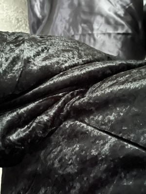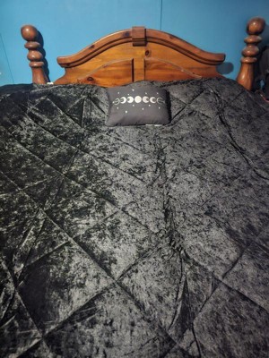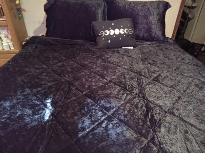 [This review was collected as part of a promotion.] I received this product so much later than it was supposed to come! I was really excited because I had been looking for a black styled bed set. I love the little phases of the moon pillow that came with it. The shams for the pillows are ok. When I put the comforter on my bed, I saw that it shed weirdly onto both my clothes and my body. After a deeper wash, this went away. The crushed velvet look is cool and unexpected, but it unfortunately isn’t as soft as I thought it would be. So I use it on top of my other blankets and don’t really use it during sleep. I was bummed that the set only came with the 2 shams, the comforter, and the moon pillow- it was supposed to be 9 pieces and I would have loved the sheets! Overall, it creates a different vibe for my room space, and I appreciate that. I definitely wish it was softer though!