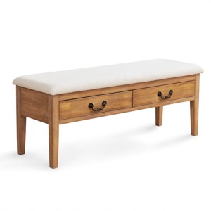Elevate your space with this stylish and functional storage bench, seamlessly blending mid-century modern elegance with practical everyday utility. The convenient drawer design to reveal spacious storage—perfect for stowing blankets, throw pillows, shoes, or other essentials—while its generously cushioned seat provides comfortable seating for two. Crafted for durability, the bench features solid wood legs for sturdy support and a plush upholstered top for added comfort. The decorative drawers add a touch of refined charm, marrying timeless tradition with contemporary flair. Whether placed in your entryway, living room, or bedroom, this versatile piece effortlessly combines organization and style, helping you maintain a clutter-free, welcoming home.