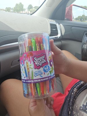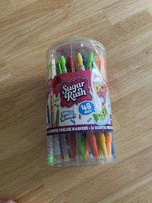 We love the Sugar Rush 48pk Assorted Set that has 16 scented gel pens, 16 scented fine line markers 16 centered, mechanical pencils. As soon as you open the container, you can start smelling the fruity smells There are several different scents and colors. The kids absolutely love these, And have a lot of fun using them.