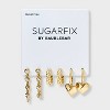 Stock up on sleek earrings that are perfect for everyday styling. The SUGARFIX By BaubleBar Gold Earring Set includes puffy heart drop earrings, braided huggie earrings, and dainty drop chain earrings. Mix and match pairs to match your look or the day, or stack them up for a cohesive and cool look.