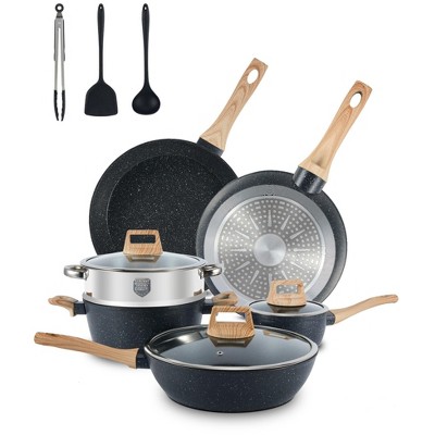 Includes: 1.5 Quart Saucepan With Lid, 4.25 Quart Saucepan With Lid, 4.5 Quart Saute Pan With Lid, 11" Frying Pan, 9" Frying Pan, Spoon, Tongs