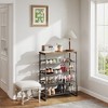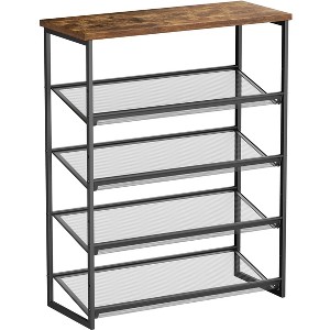 Organize your footwear neatly with this stylish 5-tier shoe rack. Featuring spacious storage that holds up to 25 pairs of shoes, each shelf provides 8" clearance, ideal for various shoe types. Its sturdy construction supports up to 20 lbs on the top tier and 18 lbs per shelf, ensuring lasting durability. Adjustable shelves allow customization, whether flat or angled, and raised edges protect walls from dirt and scuffs. Crafted from robust particleboard and steel in an attractive rustic brown and black finish, this shoe organizer complements any décor. Assembly is quick and easy with clearly numbered parts and instructions included.