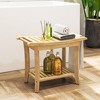 Enjoy spa-like comfort at home with this bamboo shower bench. Its ergonomic seat and anti-slip feet provide safe, sturdy support, while the dual-tier slatted design stores towels and bath essentials neatly. Water-resistant, easy to clean, and compact enough for any bathroom or entryway.
