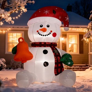 Celebrate the holidays with the cheerful SUGIFT 4FT Inflatable Snowman Christmas Decoration! This adorable snowman wears a red Santa hat and plaid scarf, holding a festive orange bell while glowing brightly with built-in LED lights. Crafted from durable, waterproof, and fire-resistant polyester fabric, it’s perfect for both indoor and outdoor use. The included air blower inflates the snowman in seconds, and the stakes and ropes ensure it stays secure even in winter weather. Add joy and sparkle to your yard, porch, or living room this Christmas season!