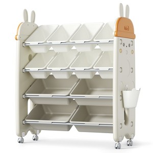 Bring playful organization to your child’s room with this bunny-inspired toy storage shelf. Featuring a durable, kid-friendly design made from non-toxic HDPE material, this organizer includes multiple tilted bins for easy access, soft silicone accents, and 360° swivel wheels for smooth movement. With a focus on safety, structure, and style, it’s the perfect addition to any nursery, playroom, or preschool.